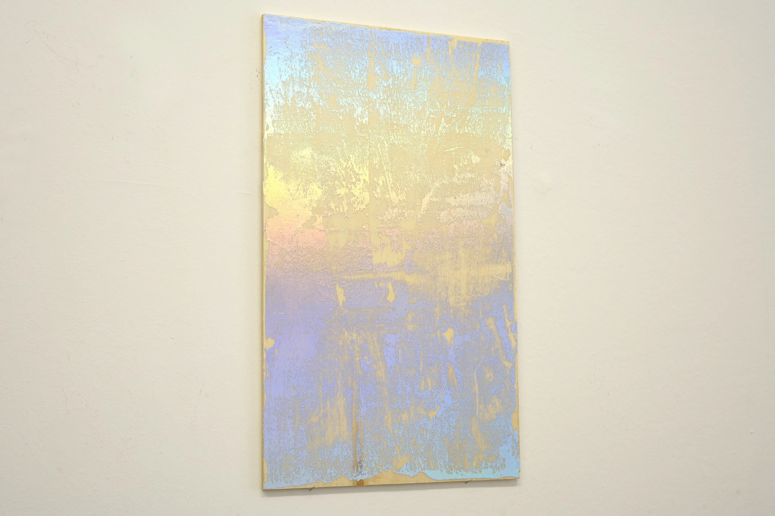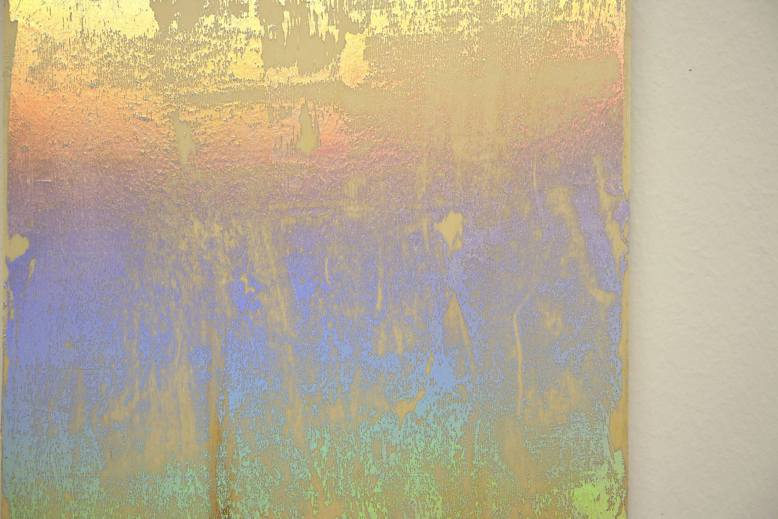 Foil stamping is a very precise printing process widely used in the industry. The heat press allows, for example, very neat shapes onto packagings or magazines. In this series of works, glue is poured generously onto wood before the foil is placed on top. The glue is directed outwards by hand before the foil is removed. The traces of gestures are at play with the texture of the wood and its absorption properties, while the artificial colors applied are contrasting with its natural colors. Some aspects of the print are predicable, while the liquid friction is left to hazard and creates a different and unpredictable drawing each time. In space, the shimmering colors are constantly changing according to the quality of the light, the time of the day and the position of the viewer.